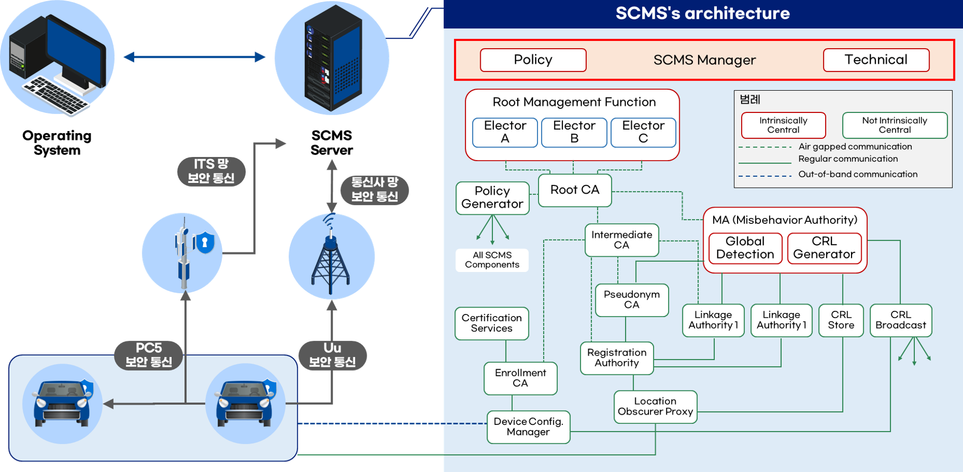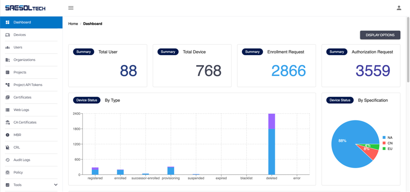 SAESOL Tech S2X CMS는 V2X, 전기차 충전 결제, 드론 보안 인증 등 다양한 모빌리티 서비스의 통신 환경에서 대규모로 높은 신뢰성을 갖춘 보안 인증서를 발급하고 관리하는 시스템입니다.