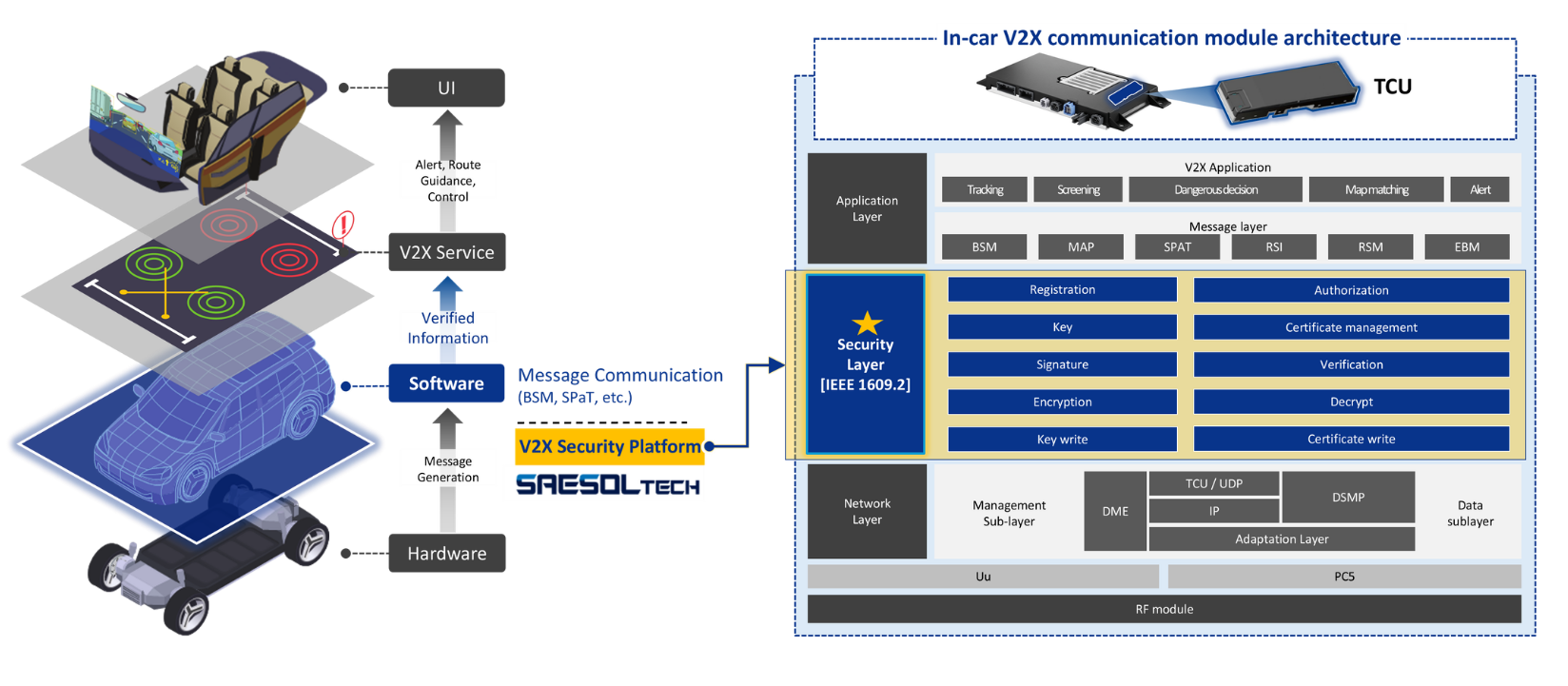 다양한 V2X 모뎀(C-V2X, WAVE)과의 연동, HSM(하드웨어 보안 모듈)을 이용한 메시지 서명 및 호환성 검증