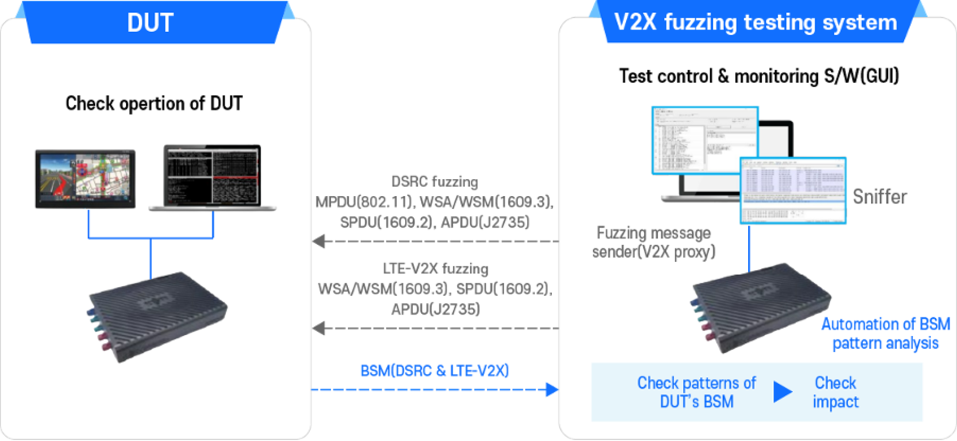 DSRC, LTE-V2X 통신을 위한 MDPU(IEEE 802.11), WSM(IEEE 1609.3), SPDU(IEEE 1609.2), APDU(SAE J2735) 등 주요 규격별 테스트 지원